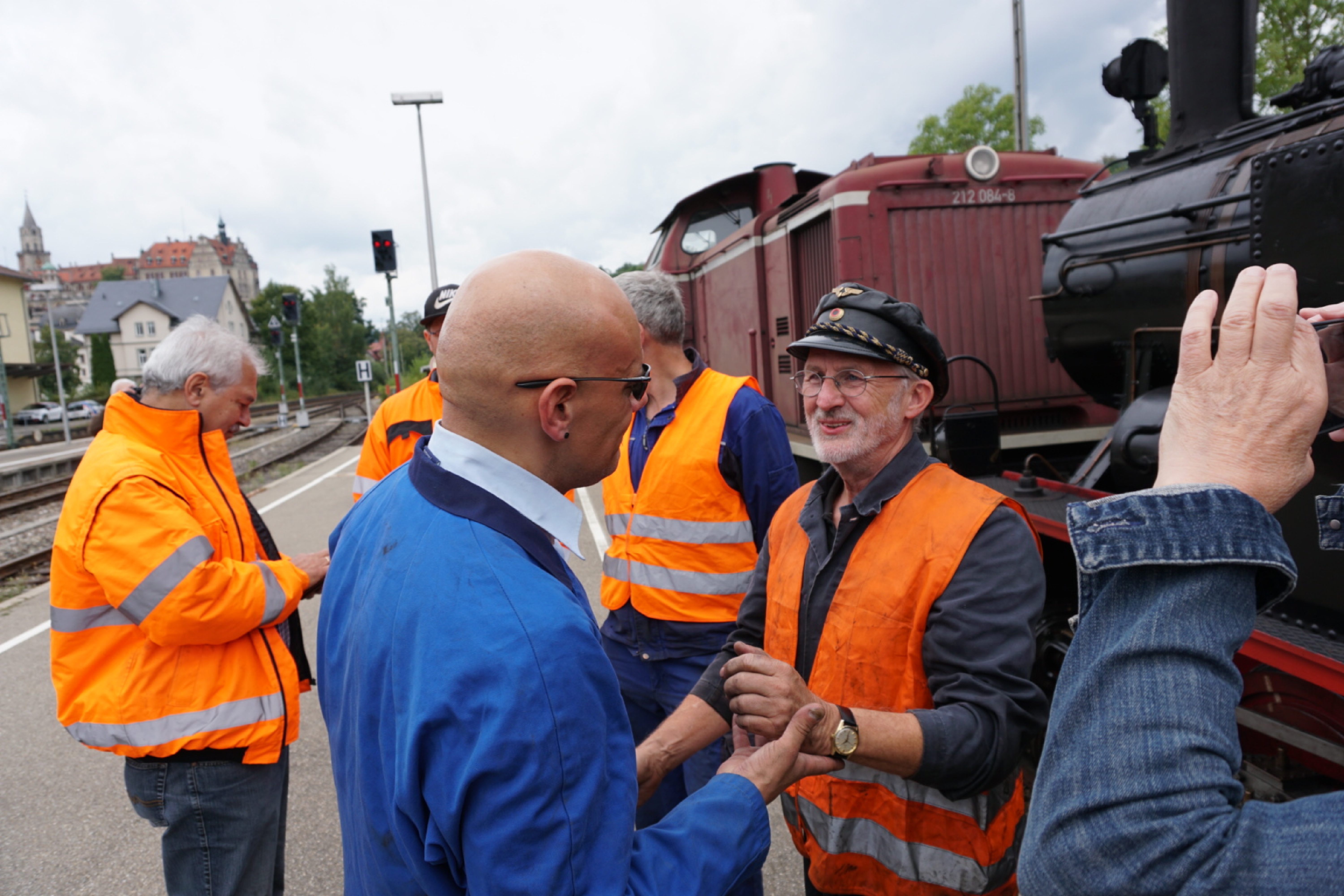 Lieber Bernd, an dieser Stelle möchten wir, der gesamte AEV, unseren Dank aussprechen! Ohne dieses Entgegenkommen deinerseits, würden wir als Verein heute wahrscheinlich längst nicht mehr existieren. Die Zeit bei der SAB half nicht nur „materiell“ in Form der zur Verfügung gestellten Infrastruktur usw. sondern auch – und das ist wahrscheinlich noch viel wichtiger – in Form von vielen guten Erinnerungen und Erfahrungen, die zeigen, wie gut die Museumsbahn heutzutage funktionieren kann, wenn man sie an den richtigen Stellen anpackt und in den örtlichen Tourismus einbringt. Wir fühlten uns in Münsingen stets als gern gesehen Gäste, und das trotz dass wir als auf den ersten Blick als womöglich „kränkelnder“ Verein zu bezeichnend, auch als Klotz am Bein gesehen hätten werden können, waren wir stets willkommen und Du konntest stets ein offenes Ohr für unsere Problemchen haben. Gerad auch in Hinsicht auf die unglaubliche Aufgabenlast und Verantwortung, die du als „Kopf“ der Schwäbischen Alb Bahn hast, erfüllt uns dies mit einer besonderen Ehre. Ein Paradebeispiel schwäbisch-badischer-Zusammenarbeit könnte man sagen.