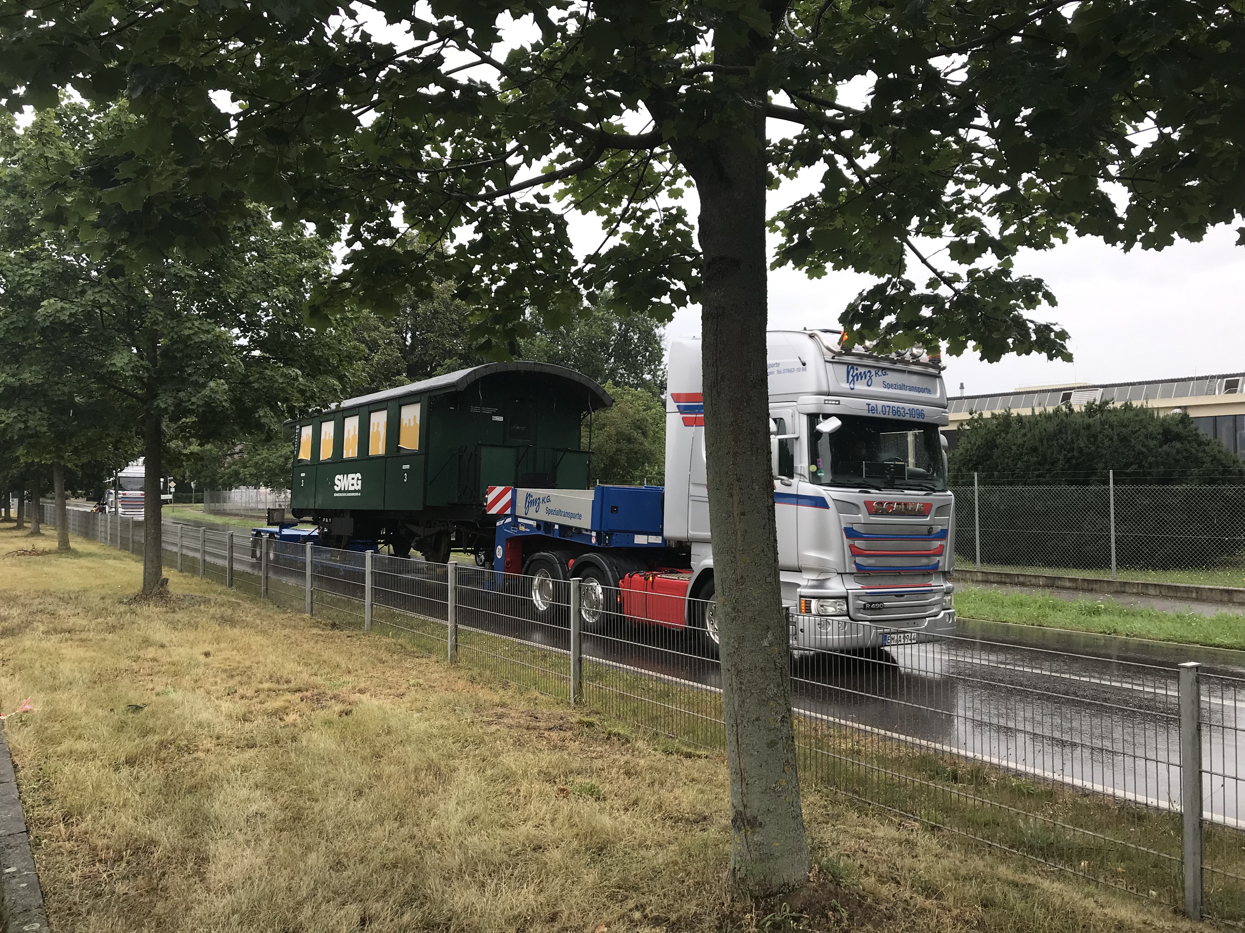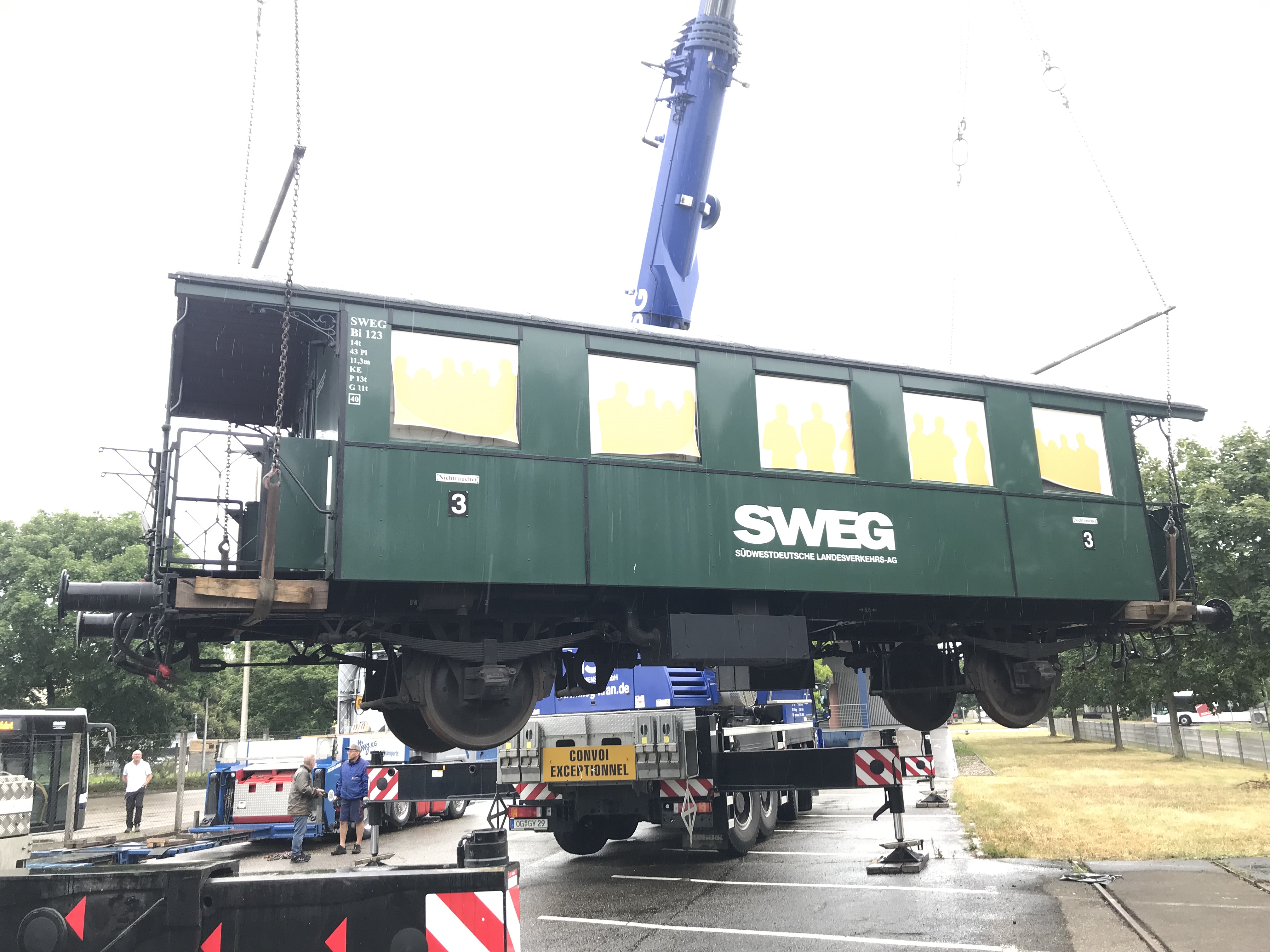 Am 15.07.2020 gelang ein großer und bedeutsamer Schritt für die Museumsbahnvereine KTB und AEV in Form der Überführung der Wagen Bi123 und Bi32 vom Lahrer SWEG Gelände zur KTB nach Kandern.