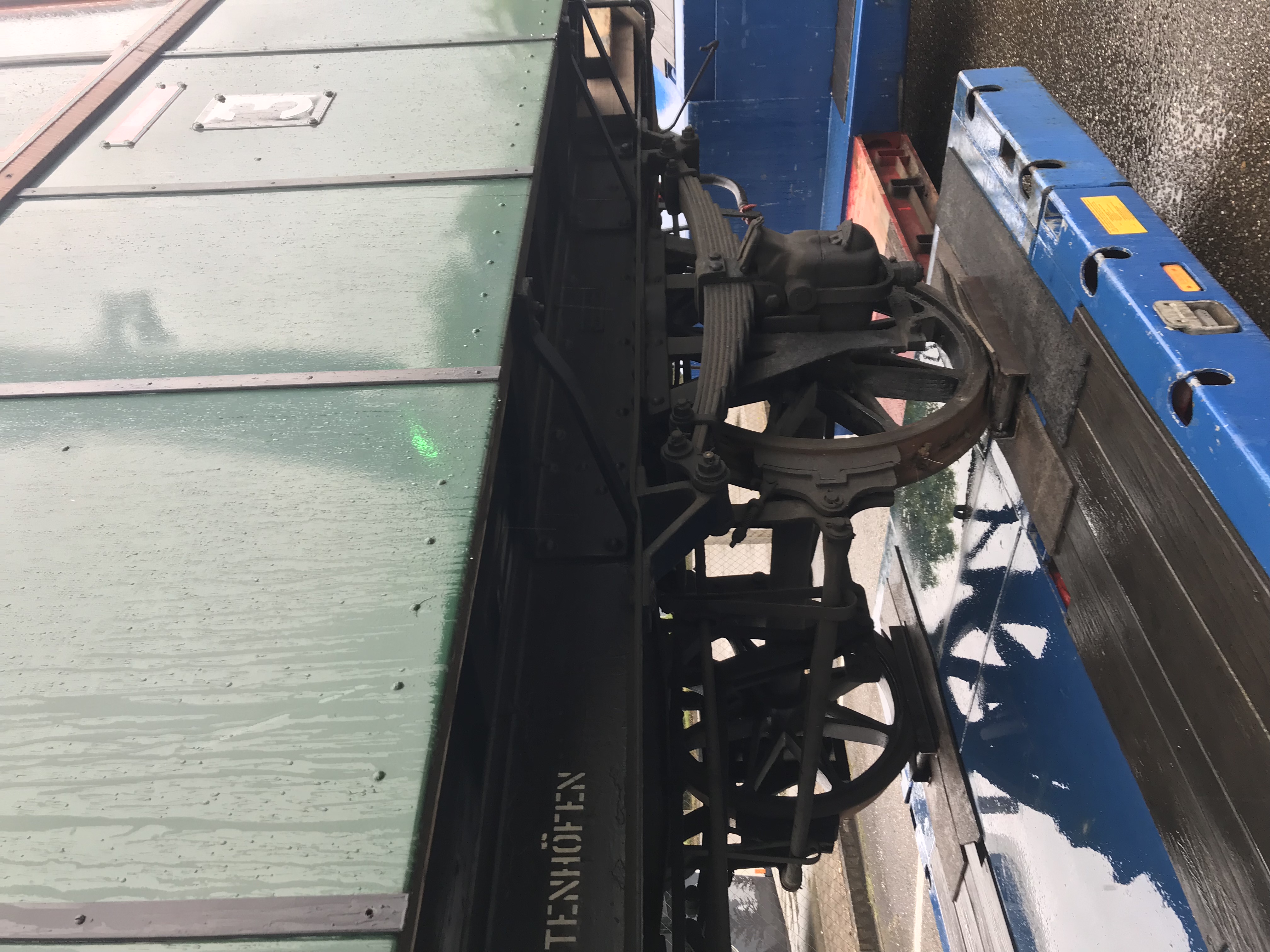 In der Tat gibt es an einigen Stellen schon deutliche Zeichen, dass eine dringende Überholung und Beseitigung von Wasserschäden durch Stand unter freiem Himmel längst überfällig sind. Die beiden Wagen wurden so also an besagtem Mittwoch mittels zwei großen Autokränen auf je einen Tieflader verladen. Am Abend zuvor war bereits ein Arbeitseinsatz in Form der Vorbereitung der beiden Wagen: In erster Linie entfernte man die Trittbretter, sodass am Tag darauf das Hebezeug in Form von Gurten und Ketten vernünftig um das Fahrgestell gelegt werden konnte. Zumal machte der Transport auf dem Tieflader diese Arbeit erforderlich. Im gleichen Zuge wurde die als Denkmal aufgestellte Lok 28 einer Entrostungskur unterzogen. Die Lok hat bekanntlich im Bereich des Antriebsgestänges viele blanke Stellen, die seit dem Aufstellen der Lok schutzlos Wind und Wetter ausgesetzt waren. Eine Entrostung mit anschließender Einölung tat der Lok sichtlich gut, sodass diese wieder ein würdiges Erscheinungsbild abgeben kann. Dennoch wird es spätestens in einem viertel bis halben Jahr erneut notwendig sein, wenn man bleibende Schäden am Gestänge verhindern möchte.