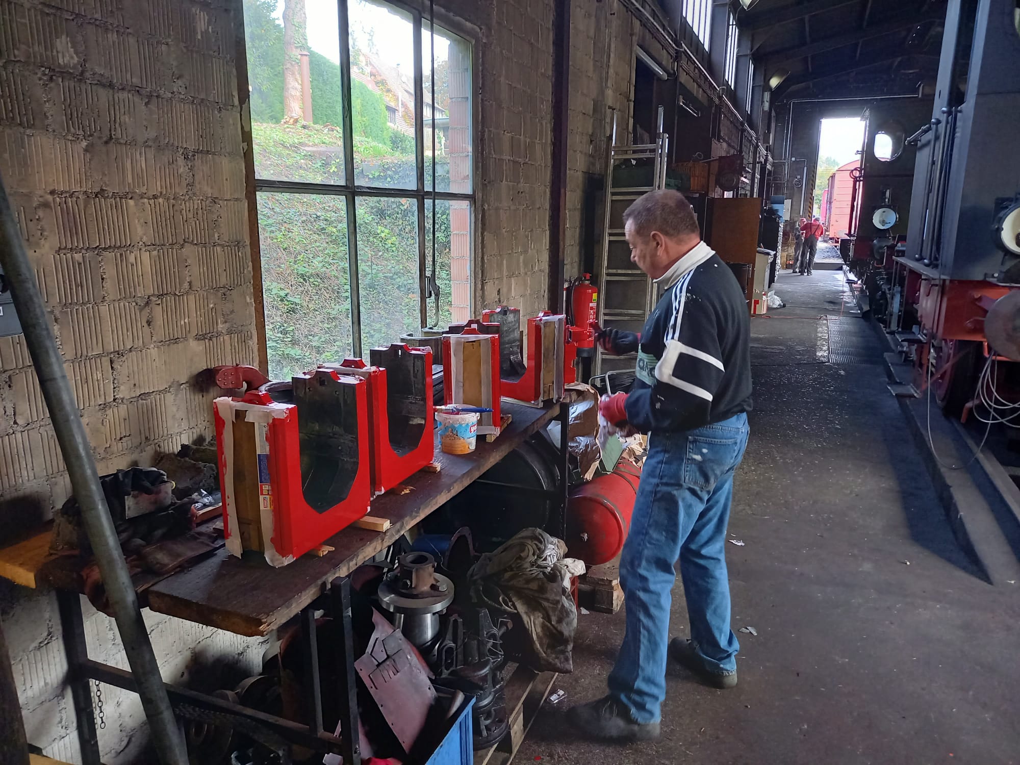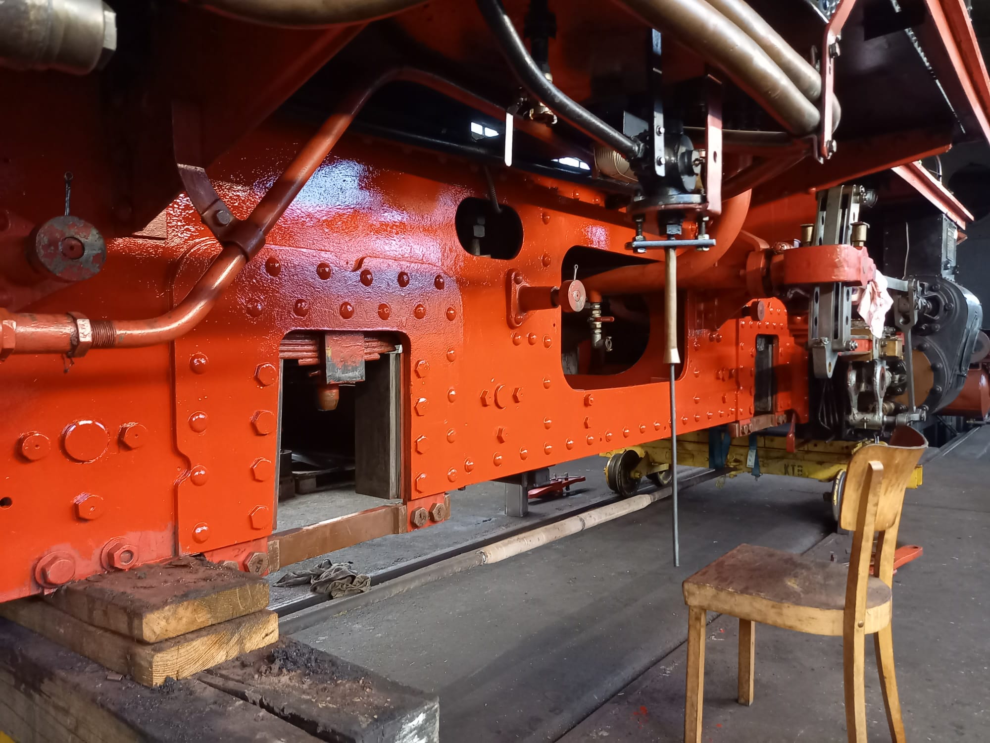 In den Wochen zuvor wurden die beiden Speichenradsätze, Gleitlagerkästen, Gestänge und Gestängelager intensiv auf Verschleißerscheinungen überprüft und für gut befunden, sodass diese wieder in die nächste HU-Periode in Betrieb gehen können. Die Gunst der Minute wurde zudem direkt genutzt, die Anstriche der Lagerkästen, Achsen und Speichenräder wieder zu erneuern, sodass diese zum Einbau wieder in neuem Glanz erstrahlen – fast wieder wie fabrikneu, als die Lok in Karlsruhe im Jahr 1928 aus den Hallen der MGK rollen durfte.