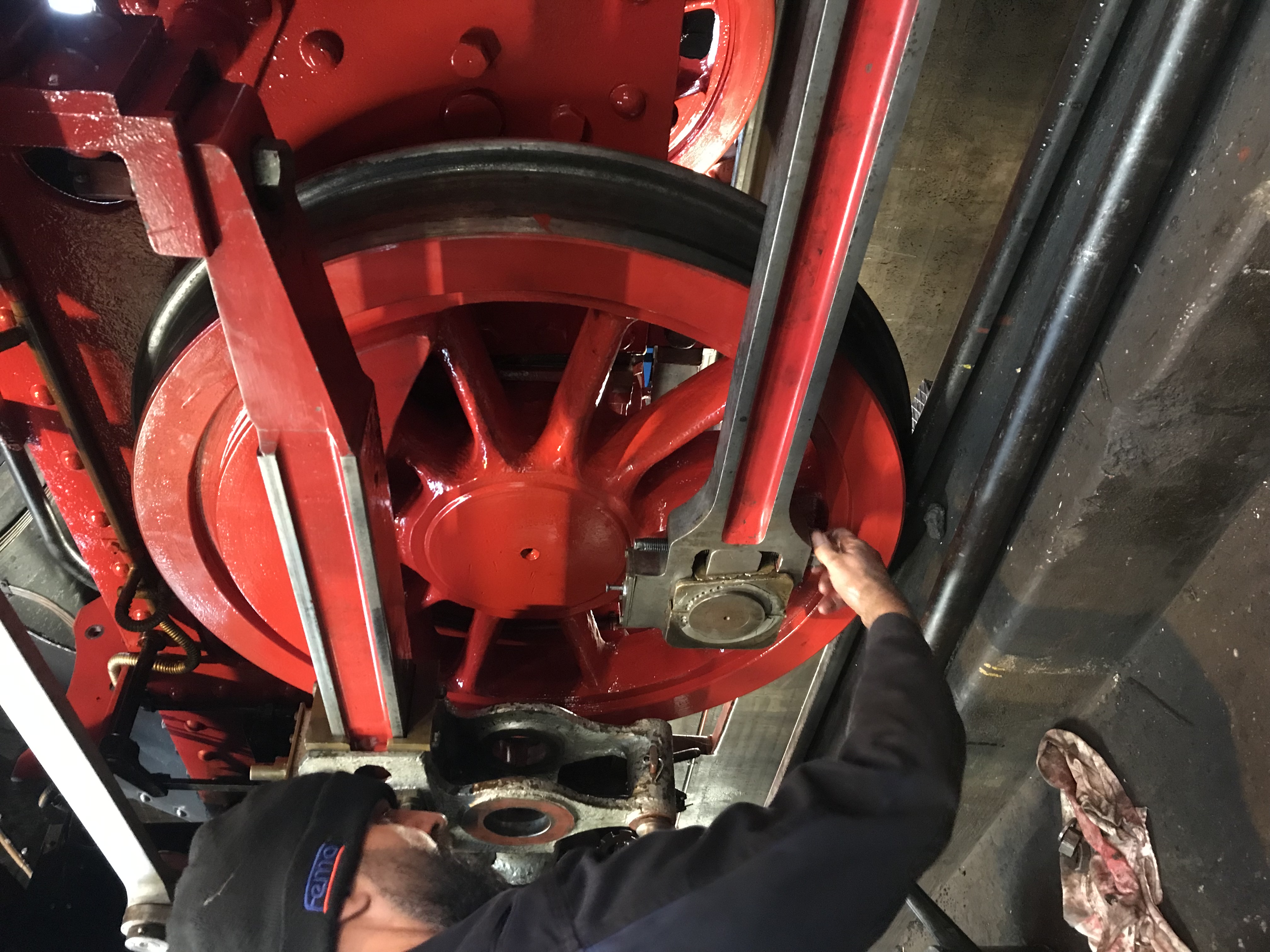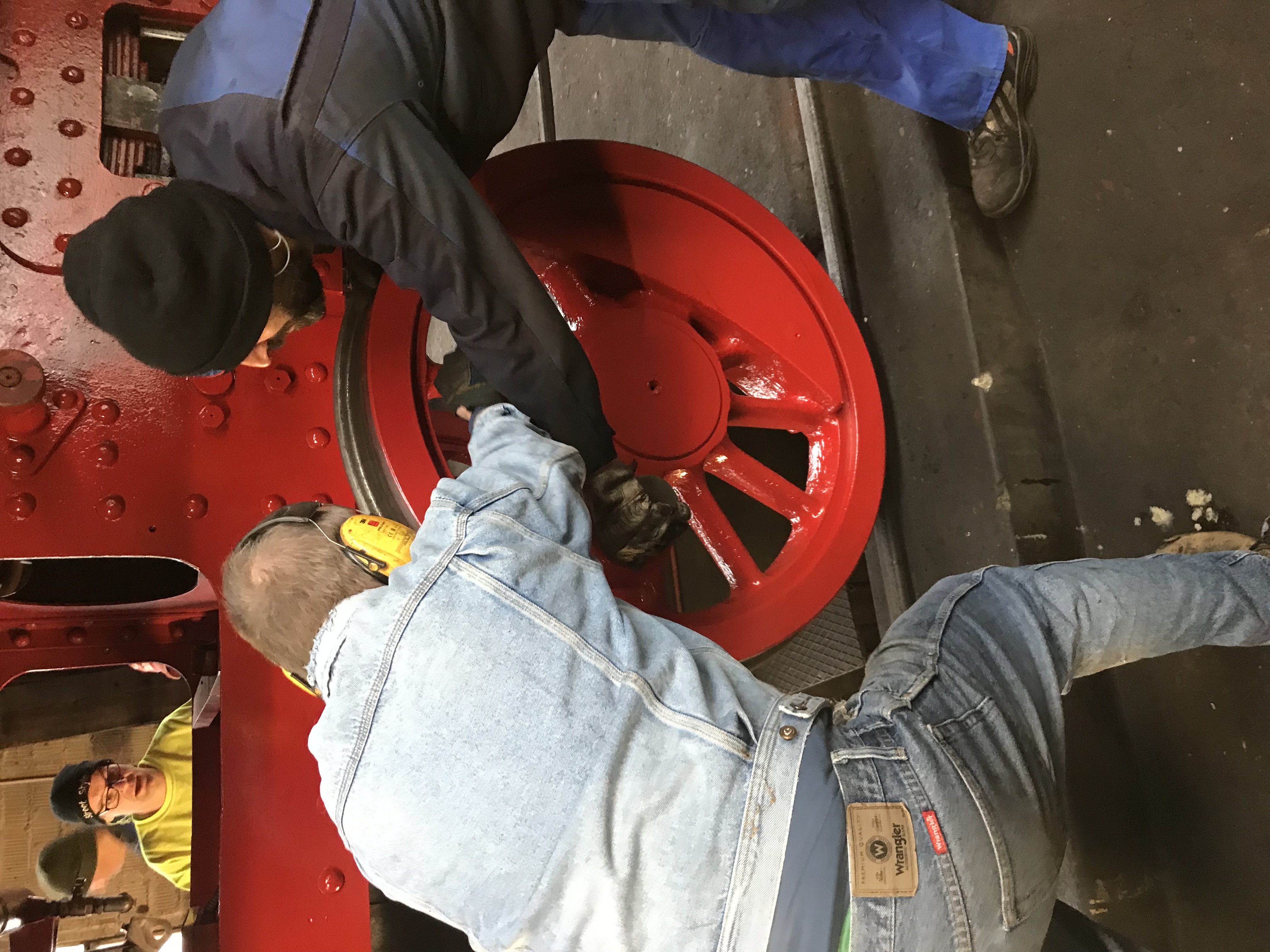 In der Realität waren bis zu sechs Mann damit beschäftigt, zu messen, justieren, beobachten. Ein Radsatz hatte es besonders in sich, dieser musste gegenüber dem leicht seitlich verschobenen Lokrahmen (vermutlich durch vorangegangene Rangierarbeiten) durch Spanngurte und reine Muskelkraft so seitlich verschoben werden (wirklich nur einige Millimeter!), dass auch hier die Führungen die Achslagerkästen wieder aufnehmen. Aber auch vor solchen Herausforderungen schreckt die Schraubertruppe nicht zurück und am Ende des gestrigen Samstags war die Lok komplett eingeachst, die Radlagerkästen wieder im Rahmen fixiert und schließlich auch die Kuppelstangen montiert.