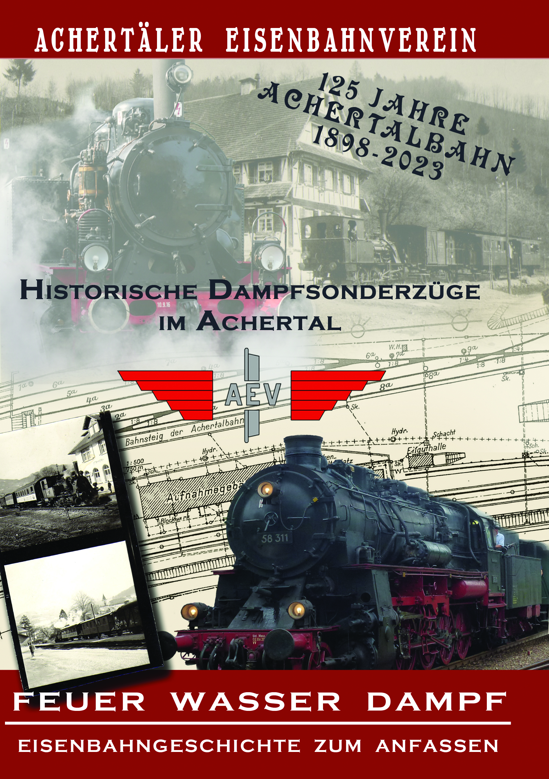 Damit sind auch die Fahrzeiten und Fahrpreise für den 29.05.23 fest und verbindlich. Das Plakat ist dieses Jahr mit einigen historischen Bildern aus der Geschichte der Achertalbahn versehen, denn es gibt dieses Jahr noch ein Jubiläum zu feiern: 125 Jahre Achertalbahn!