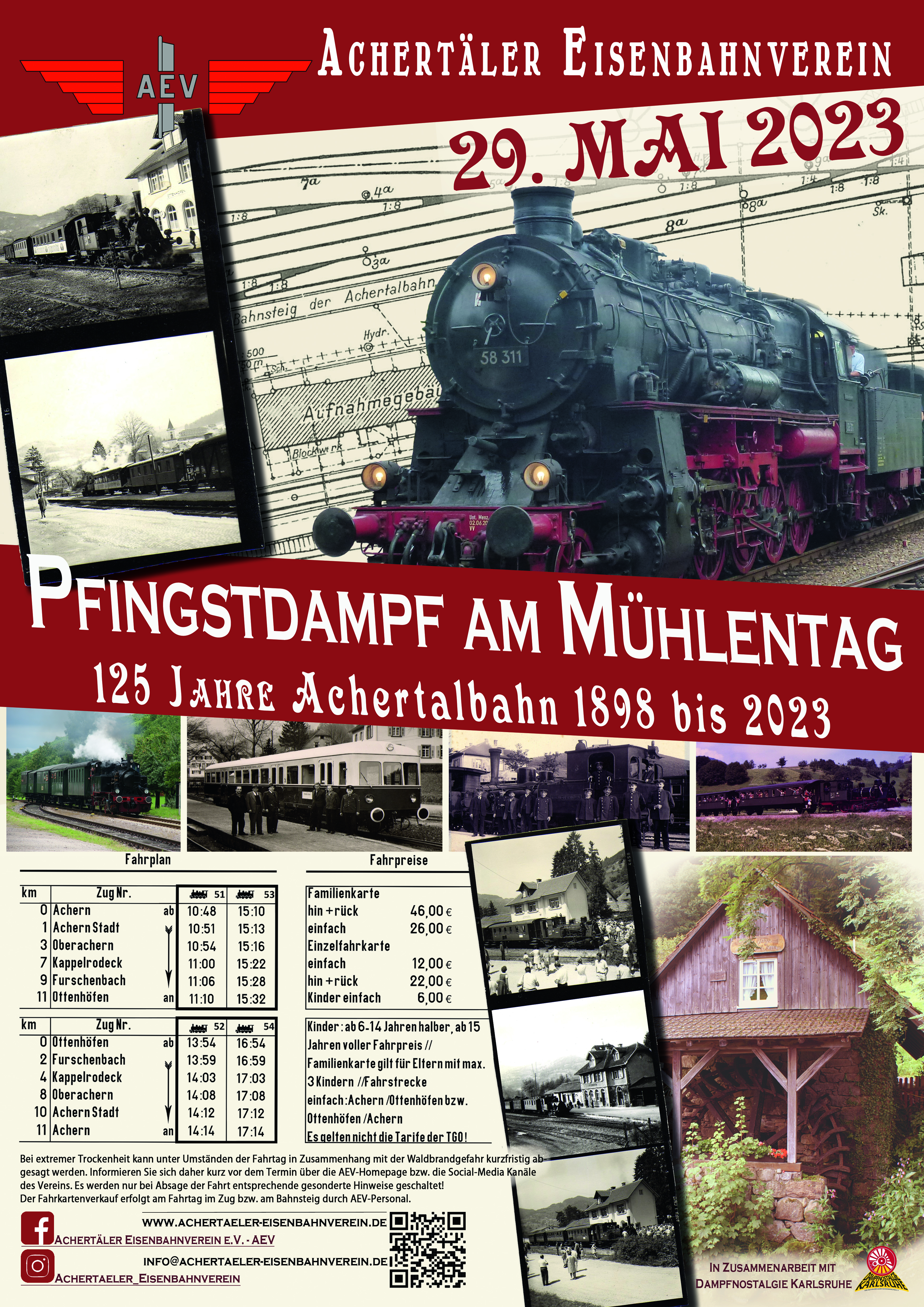 Wer bereits die Überführungsfahrt des Zuges von Karlsruhe nach Achern am 06.06.22 miterleben will (entsprechend Abends auch die Rückfahrt von Achern nach Karlsruhe), kann sich über die Fahrpreise und Fahrzeiten auf der Webseite der Dampfnostalgie Karlsruhe informieren: www.dampfnostalgie-karlsruhe.de