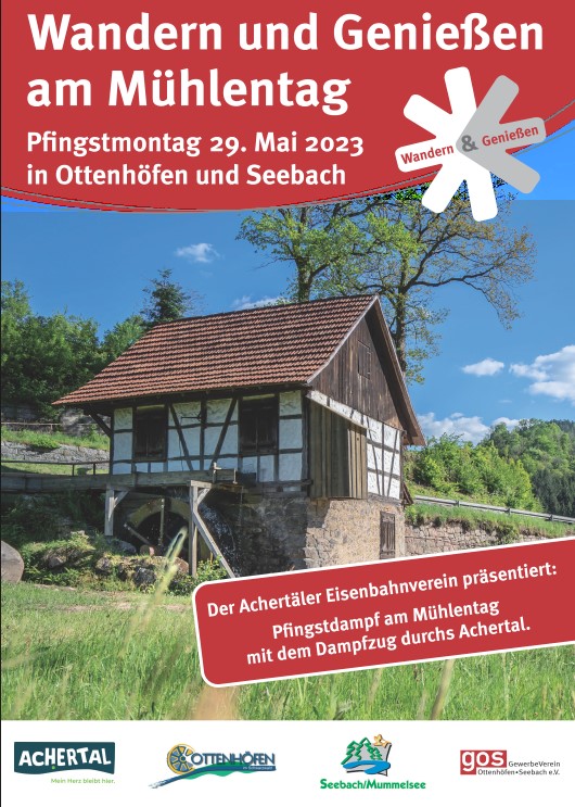 Am Mühlentag sind zahlreiche Mühlen in Ottenhöfen und Seebach zu besichtigen, mehr auch unter der Touristinfo Ottenhöfen oder Seebach. Entdecken Sie außerdem das Achertal nach oder vor der Dampfzugfahrt zu Fuß auf einem der zahlreichen Wanderwegen: