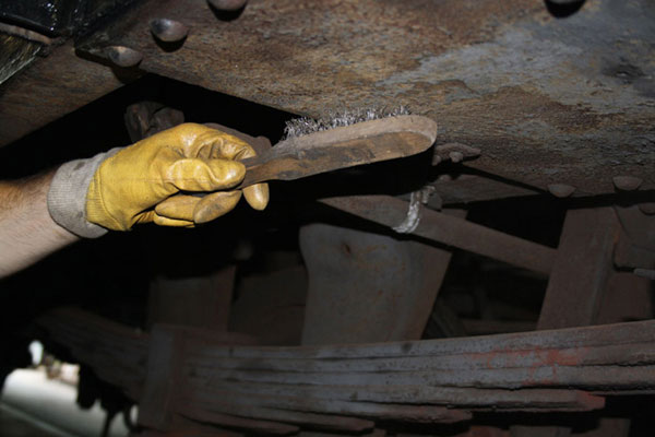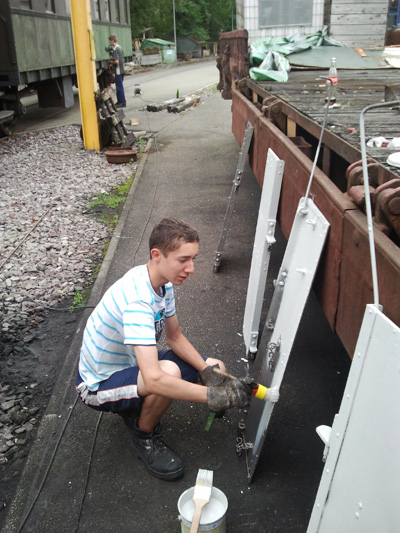 Den Außenanstrich hat die Sonne im Laufe der Jahre ausgebleicht. An den Seitenwänden, dem Rahmen und an beiden Plattformen hat der Rost deutliche Spuren hinterlassen. Rahmen und Seitenwände wurden inzwischen komplett abgeschliffen und entrostet. Demnächst werden Seitenwände und Rahmen neu lackiert. Der größte Teil des Dachs ist bereits mit Weißaluminium gestrichen. An einigen Stellen muss dort noch etwas nachgebessert werden.
